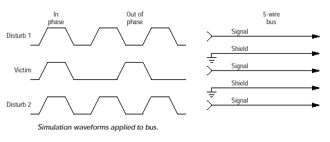 Для оценки влияния перекрестных помех и межсимвольной интерференции использовались временные диаграммы сигналов пятивыводной базовой модели. По трем из пяти линий шины передается информация, а две остальные выполняют функцию "экрана". По центральной линии передается сигнал-"жертва", а сигналы-"агрессоры" первоначально распространяются в фазе с сигналом-"жертвой", затем — в противофазе. В результате проводятся измерения временных характеристик сигналов в разных точках шины — с данным набором сигналов исследуется изменение времени нарастания и времени спада сигнала-"жертвы" при синфазном и противофазном воздействии на него сигналов-"агрессоров". Также, при моделировании с полностью нагруженной шиной для коротких и длинных периодов следования сигнала-"жертвы" можно наблюдать эффекты межсимвольной интерференции.