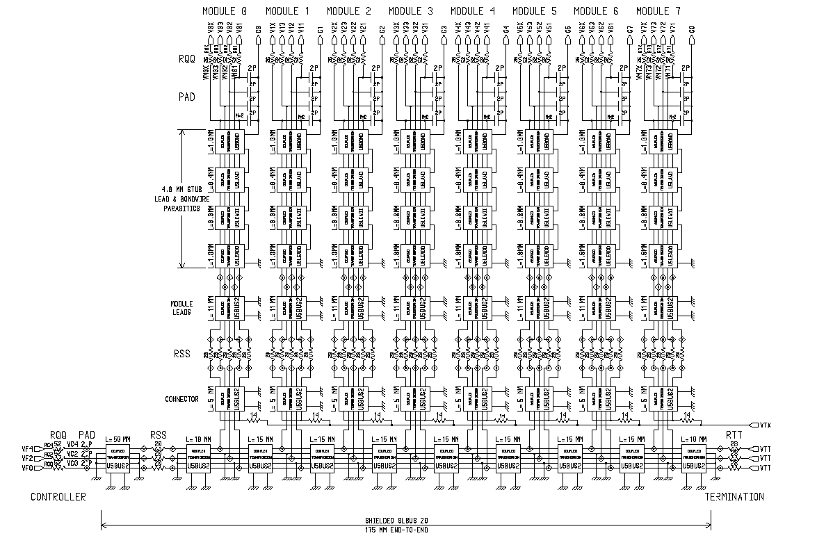 В рамках этой статьи мы рассмотрим модели структур шины памяти, приближающеся к реальным интерфейсам DRDRAM и SLDRAM, что даст не только достаточно глубокое представление о самих подсистемах и о базовой концепции конструирования высокоскоростных интерфейсов (не только памяти, а шин вообще), но и поможет понять трудности, с которыми приходится сталкиваться разработчикам в проектировании и создании современных цифровых СВЧ-схем и устройств. Данное изучение фокусируется на моделировании структур RAMBus (шина Direct RDRAM) и SLBus (шина Sync-Link DRAM) при помощи средств программного пакета HSPICE от Meta-Software в окружении UNIX, которое было проведено в начале 1999 года специальной исследовательской группой компании MOSAID Technologies. Целью проводимого моделирования является сравнение эффективности двух рассматриваемых структур, их помехозащищенность, а также выявление "узких мест", на которые следует обратить особое внимание. Однако в рамках настоящей статьи мы ограничимся лишь сравнительным анализом полученных результатов моделирования непосредственно внешних шин DRDRAM и SLDRAM и не будем рассматривать эффективность используемых сигнальных протоколов, сравнивать потребляемую мощность и сложность устройств, а также принимать во внимание конечную цену.