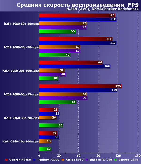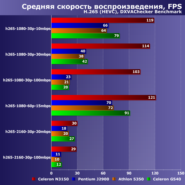 Из оставшихся участников тестирования блок аппаратного декодирования потока H.265 обнаружился только у Intel Celeron N3150, и это полностью совпадает с заявленными спецификациями платформ. Занятно, что скорость декодирования H.265 у нового процессора Intel оказывается даже немного выше, чем для более старого и распространенного H.264. Особенно это важно и заметно при воспроизведении видео в разрешении 2160p: если на роликах AVC были заметны пропуски как в режиме бенчмарка, так и в обычных плеерах, то с HEVC ситуация несколько выправляется, ролики 4K с адекватным битрейтом можно смотреть на скорости 30 кадров в секунду. Правда, «запаса прочности» по-прежнему не наблюдается, что несколько настораживает и расстраивает.