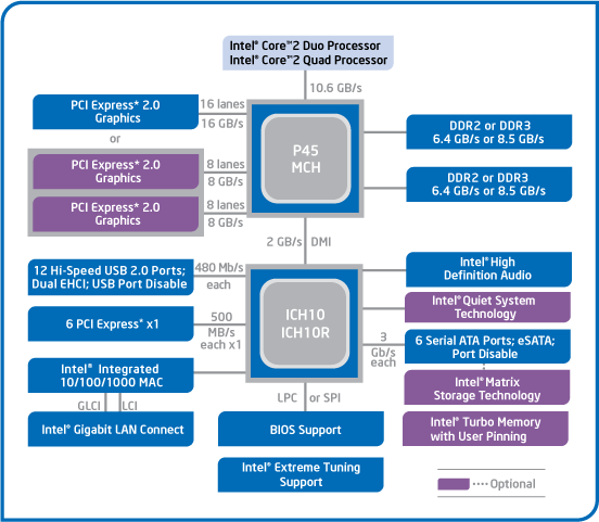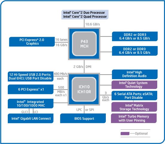 - шина DMI (с пропускной способностью ~2 ГБ/с) до нового южного моста ICH10/R.