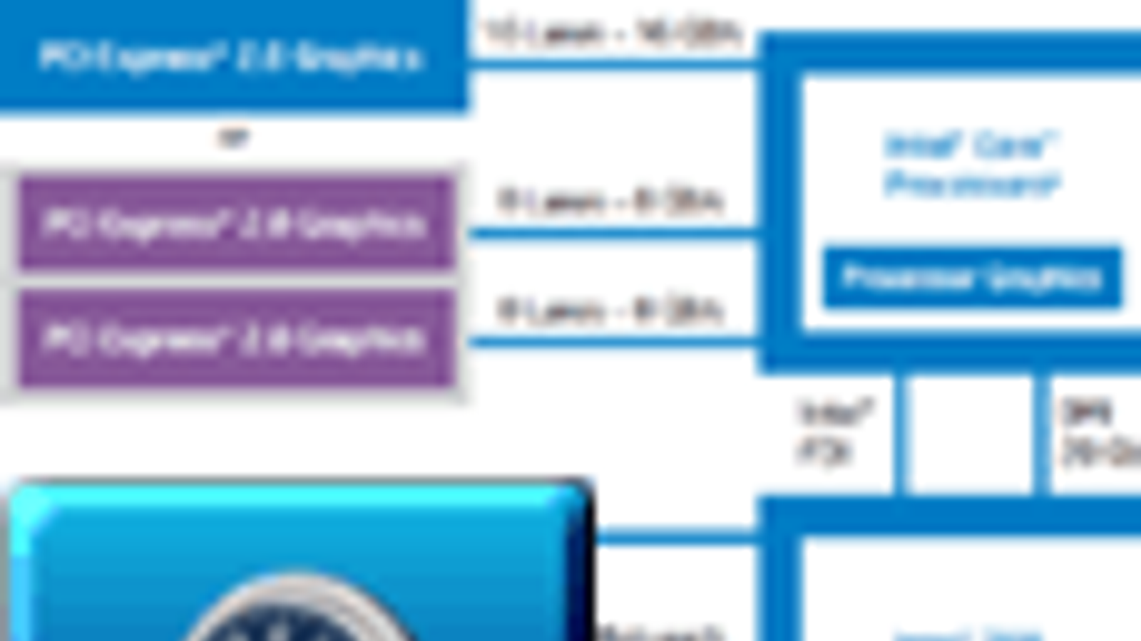 Как мы уже упомянули, Z68 объединил достоинства чипсетов серии 6x, поддерживая одновременно встроенную графику новых процессоров (вывод картинки, формируемой видеоядром и пересылаемой по специальному интерфейсу FDI, на дисплей через набор видеовыходов на любой вкус: HDMI 1.4, Display Port, DVI, аналоговый d-Sub; два независимых потока), работу двух видеокарт в режиме x8+x8, а также не помеченные (явно) на блок-схеме возможности для разгона процессоров (включая вариант с разгоном видеоядра).