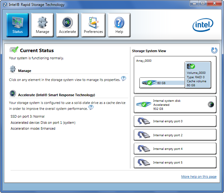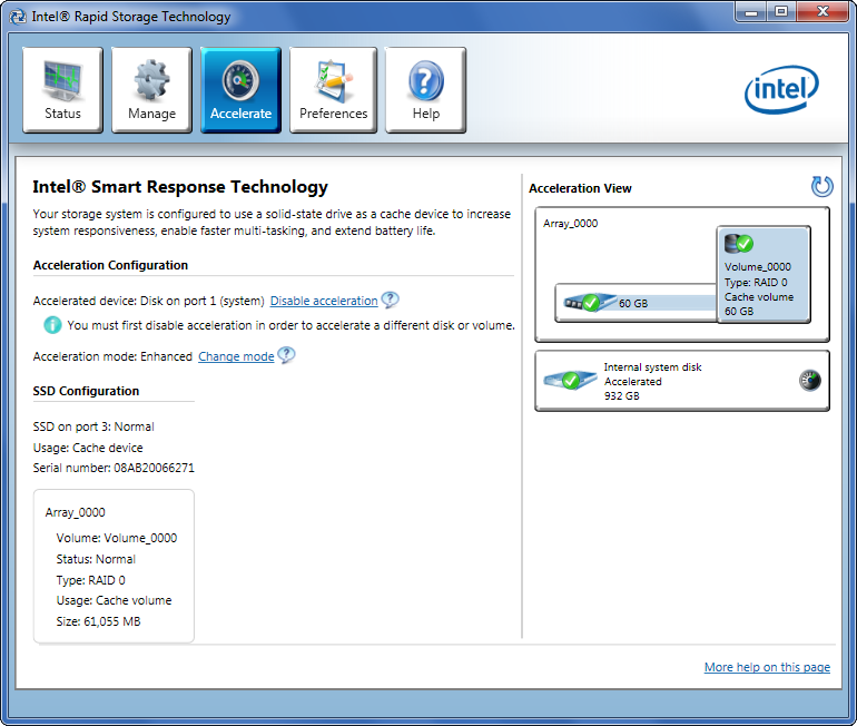После выполнения этих процедур (и перезагрузки) система начинает видеть вместо системного винчестера и кэширующего SSD один RAID-массив (в случае, конечно, если вы отдали под кэширование весь объем флэш-накопителя). С помощью той же фирменной утилиты Intel можно в любой момент сменить режим кэширования (Enhanced/Maximized) и отказаться от ускорения работы винчестера вовсе (после перезагрузки система снова увидит два отдельных накопителя, при этом SSD будет девственно чист).