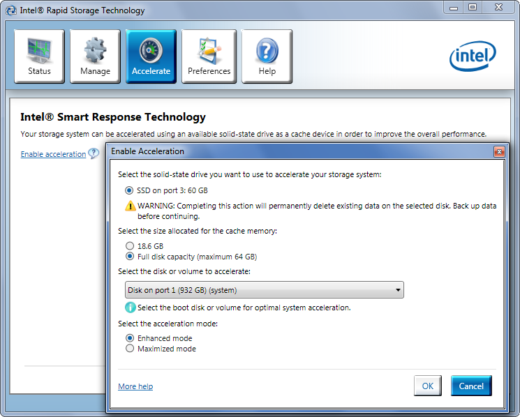 Обратите внимание, что все данные на «кэширующем» накопителе будут потеряны! (А на кэшируемом — разумеется нет.) Режимы Enhanced и Maximized отличаются тем, что в первом случае запись кэшируется, но все же производится сразу и на винчестер, а во втором — сброс данных на винчестер осуществляется порциями через некоторые интервалы времени, по внутренней логике управляющей программы. Соответственно, в режиме Enhanced данные не теряются никогда, но не достигается максимальная производительность подсистемы, а в Maximized — наоборот. Intel логично рекомендует в общем случае использовать Enhanced.
