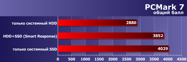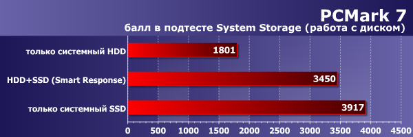 Что ж, включение Smart Response выглядит здесь очень привлекательно: производительность такой системы не дотягивает до варианта, когда ОС и приложения ставятся на SSD (и запускаются с него), но не дотягивает совсем немного, зато, в свою очередь, почти на треть превосходит вариант с использованием одного только винчестера. Желающие могут скачать и поизучать подробно отчеты PCMark 7, остальным достаточно знать, что, абсолютно ожидаемо, лишь одна группа подтестов демонстрирует разницу между такими тремя конфигурациями — группа System Storage, работа с диском. Причем если суммарный балл System Storage Score дает варианту со Smart Response менее чем двукратное превосходство над «голым» винчестером, то в отдельных подтестах разница доходит и до 5-кратной, а 2-кратная — рядовое явление. Не будем, однако, медитировать на эти результаты, потому что…