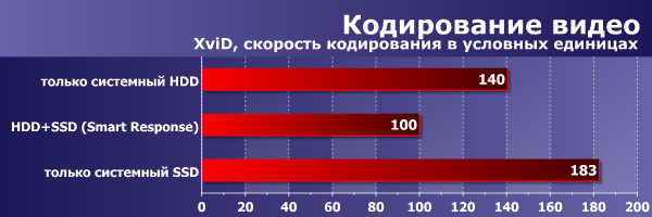 К тому же, визуальными наблюдениями в дополнение к синтетическим тестам мы тоже не ограничились. Из реальных приложений, выдернутых наугад из методик тестирования разных лет, любопытный результат дали тесты кодирования видео в VirtualDub с помощью древних кодеков и настроек. Современному процессору на ядре Sandy Bridge такая задача оказалась более чем по плечу, а интересным результат стал из-за того, что тест, когда-то задуманный для проверки скорости процессоров (еще Pentium 4) в итоге протестировал скорость работы с диском в нетривиальных условиях. Здесь прекрасно проявил себя SSD, а вот кэширование Smart Response в данном случае оказалось не просто бесполезным, но и создало, по всей видимости, конфликт доступа к данным, сильно затормозив процесс. Не стоит принимать эти результаты слишком близко к сердцу, и уж тем более не стоит полагать, что Smart Response «не подходит для кодирования видео». Однако факт существования сценариев, в которых усложненная система с кэшированием оказывается даже менее эффективна, чем оригинальная, налицо.