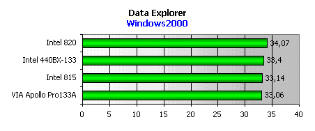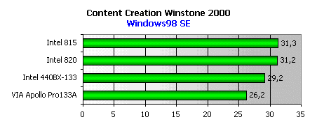 Здесь расклад несколько другой, так как в этом тесте используется более широкий спектр типовых офисных приложений. Но лидирует опять i815, подтверждая тот факт что контроллер памяти в этом чипсете один из самых лучших. Даже никогда ранее непревзойденный i440BX отстал от нашего новичка на пару пунктов.