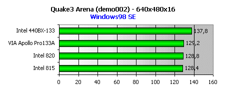 Стандартный тест в низком разрешении в Quake3 обнаруживает превосходство разогнанного i440BX, функционирующего при частоте FSB 133 МГц.