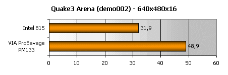 Зато в играх VIA ProSavage PM133 отыгрывается, что называется, по полной программе. Получается, что превосходство производительности 3D-части графического ядра чипсета от VIA составляет даже больше, чем 50%. Поэтому, используя встроенную графику VIA PM133, часто можно играть в современные игры даже в разрешении 800х600. Про i815 такого сказать нельзя
