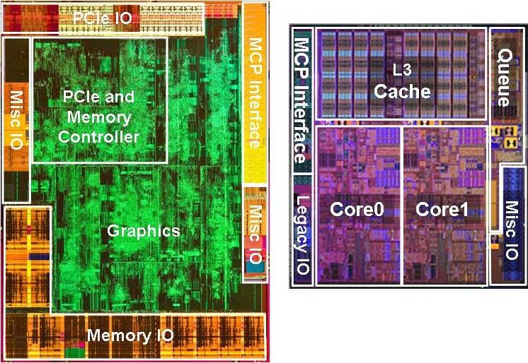 Как вы уже, конечно, знаете из наших статей, новое поколение интегрированной графики Intel сменило место прописки, переместившись в процессоры, основанные на ядре Clarkdale. Любопытно, что системная архитектура этого ядра отличается от Bloomfield/Lynnfield, у которых всё новые компоненты северного моста чипсета перекочевывали поближе к процессорным ядрам. У Clarkdale графический ускоритель переехал под процессорную крышку не один, а в компании с контроллером памяти и PCI Express для внешней графики, оставшись при этом с ними единым кристаллом, всего лишь связанным с собственно процессорным кристаллом шиной QPI. То есть здесь, скорее, можно говорить не об интеграции, а лишь о физическом совмещении, причем к процессорным ядрам микроархитектуры Nehalem добавился, по сути, северный мост чипсета Intel G45. (Неудивительно, что и низкоуровневые характеристики контроллера памяти у новых Core i5 заметно отличаются от таковых у прежних процессоров с формальной той же микроархитектурой.)