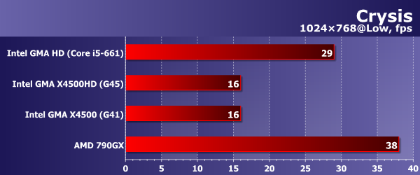 Для игры с теми же настройками в Crysis существующим интегрированным решениям пока пороху не хватает, так что мы ограничились показателями в режиме 1024×768 также при самом низком качестве графики. Впрочем, общая картина от этого не меняется абсолютно, лишь пропорционально подрастают или убывают столбики на диаграммах. AMD 790GX опять прилично опережает встроенное видео нового поколения Intel.