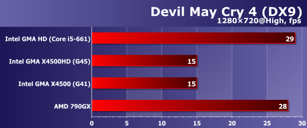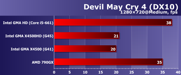 Мультиплатформенный проект Devil May Cry 4 более снисходителен даже к интегрированным видеоускорителям, позволяя поднять уровень графики до High (в случае рендеринга через DX9) при сохранении оговоренных ~30 fps. Впрочем, при использовании DX10-движка игры AMD 790GX существенно проседает по скорости, так что мы взяли показатели соревнующихся систем в том же разрешении, но при сниженном (до среднего) качестве картинки. Как видите, разницы между этими вариантами практически нет, да и в сравнении с представленными выше диаграммами можно найти всего одно небольшое отличие: GMA HD, наконец, опередил Radeon HD 3300.