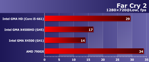 Очень похожа расстановка сил в Far Cry 2, только для достижения своих ~30 и ~15 fps соответственно участникам тестирования пришлось покорять игру в чуть более низком разрешении и при самых низких настройках качества. По-прежнему Intel HD Graphics и AMD 790GX на голову превосходят своих соперников, но здесь они примерно равны между собой (Radeon HD 3300 лишь немного быстрее).