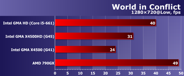 В World in Conflict встроенное видео AMD 790GX также лидирует (хотя минимальное значение fps у него хуже, чем у Intel HD Graphics), а в целом картина не столь отчетлива: показатели участников «размазаны» более равномерно, чем в прошлых случаях, нет четкой границы между сильными и слабыми. Впрочем, общие выводы, которые уже наверняка успели у вас сложиться по ситуации в играх, приведенные цифры лишь подтверждают.