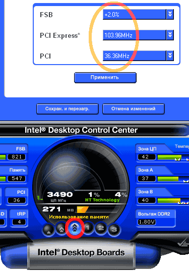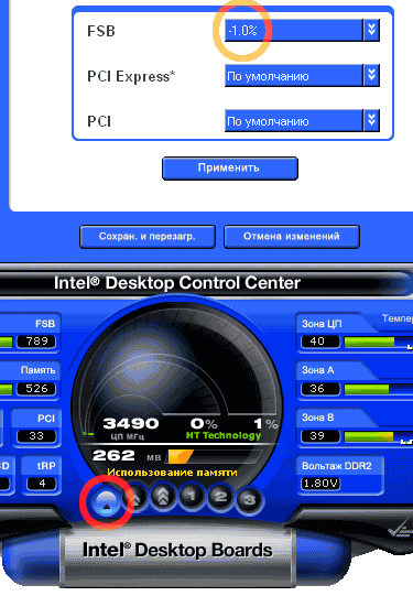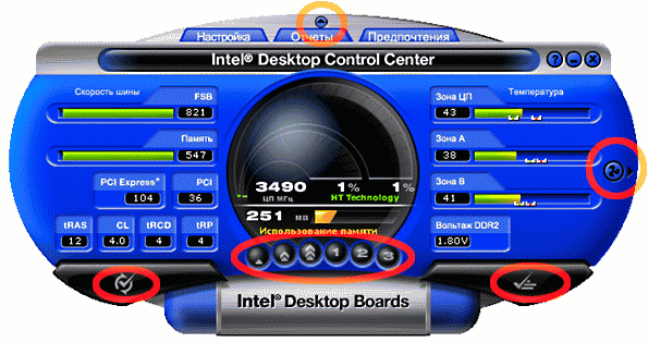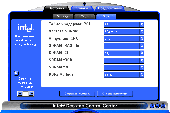 - Intel Desktop Control Center. Своего рода компромисс между программой для тонкой настройки параметров аппаратной части (такое ПО принято именовать «оверклокерским», хотя это и не совсем справедливо) и утилитой системного мониторинга. Впрочем, справедливости ради, заметим, что для последней цели Desktop Control Center применять вряд ли стоит, т.к. он не может быть свернут в трей и постоянно «висит» на панели задач. Зато во всем, что касается настройки, DCC вполне удобен и функционален: с его помощью можно изменять большинство настроек платы, сосредоточенных в BIOS Setup — но без необходимости его применения. Правда, перезагружаться все равно иногда приходится. Также радует, что изменения, внесенные с помощью DCC, отражаются и на установках BIOS.