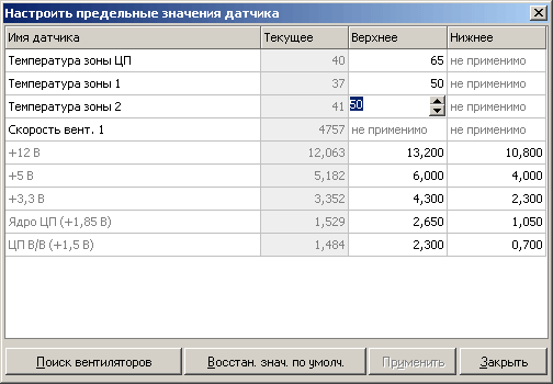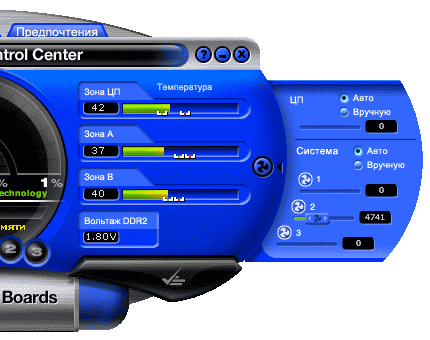 Боковая панель предоставляет информацию о наличии и частоте вращения трех вентиляторов (как правило — процессорного и двух системных). Ее содержимое вполне прозрачно и не требует особенных пояснений.