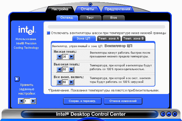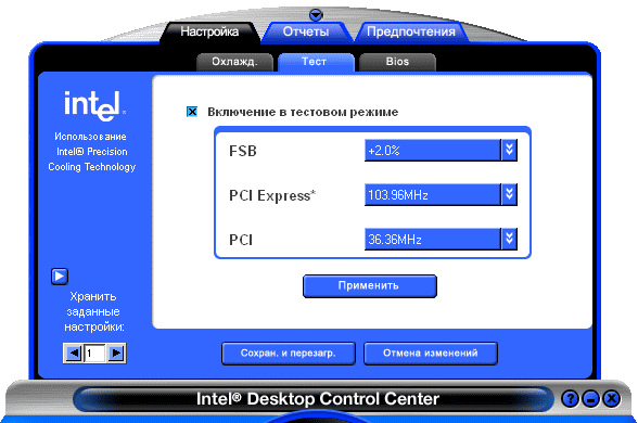 Закладка «Настройка —> Тест» позволяет включить так называемый «тестовый режим», что в случае с платами Intel является эвфемизмом, позволяющим не называть кошку — кошкой, и избежать употребления термина «оверклокинг». Установки закладок «Охлаждение» и «Тест» (в комплексе т.е. все три пороговых температуры + частоты FSB, PCI, и PCI Express) могут быть записаны в один из четырех профилей (см. на скриншоте «Хранить заданные настройки: … »). Профиль с нулевым номером является вызываемым по умолчанию, остальные могуть быть активированы вручную. К вопросу о том, как это делается, мы вернемся чуть позже.