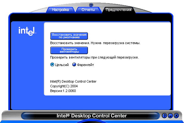 Закладка «Отчеты» является минималистичным аналогом программы диагностики оборудования и позволяет получить краткую информацию об аппаратной начинке системы. «Предпочтения» — еще более лаконичная закладка, она позволяет вернуться к параметрам по умолчанию, инициировать процедуру проверки наличия вентиляторов с возможностью контроля оборотов, а также выбрать формат отображения значений температуры — градусы Цельсия или Фаренгейта.