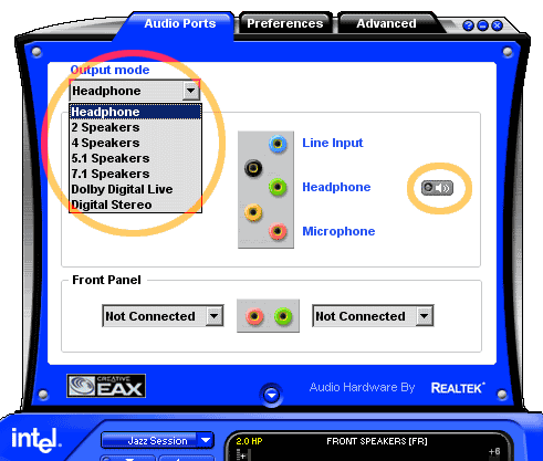 Верхняя панель содержит несколько закладок. Первая из них (Audio Ports) позволяет настроить режимы воспроизведения (указать тип подключенных устройств и, в зависимости от типа, режим работы аудиочипа) и посмотреть, какие из устройств подключены к каким разъемам. Заслуживает внимания тот факт, что IAS способна сама «расширять» (программным способом, разумеется) обычный стереозвук вплоть до формата 7.1, т.е. если выбрать пункт «7.1 (5.1) Speakers», то даже при воспроизведении стереодорожки звучать будут все аудиосистемы, а не только левая и правая. Впрочем, среди «истинных гурманов» подобные экзерсисы популярностью, как правило, не пользуются…