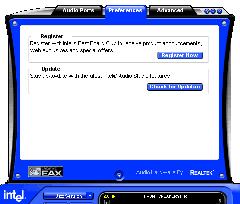 Вторая закладка, несколько нелогично, на наш взгляд, названная «Preferences», позволяет (точнее, декларирует возможность) проверить наличие свежей версии Audio Studio, а также содержит кнопку для вызова процедуры онлайновой регистрации в Best Board Club. Мы не зря употребили выражение «декларирует возможность», потому что нажатие на кнопку «Check for updates» на самом деле просто отправляет нас на страничку Audio Studio на сайте Intel, но выяснение вопроса о том, какая версия IAS стоит на компьютере пользователя, и насколько она свежа — оставляет выяснять самому пользователю. Поэтому нам данная функция программы показалась несколько… употребим самый мягкий термин — «недоделанной».
