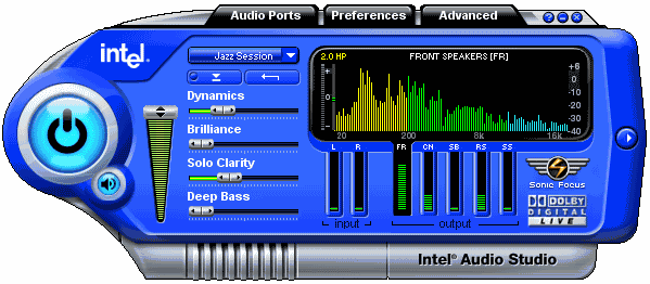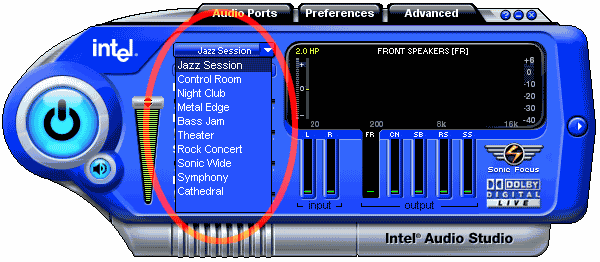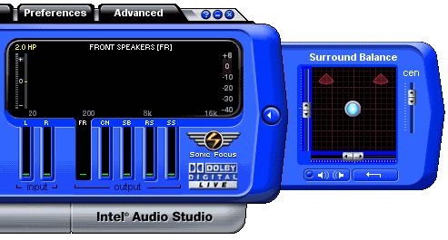 - Intel Audio Studio. Фактически, это набор цифровых фильтров, реализованных программным способом (без DSP, с использованием ресурсов центрального процессора), которые могут динамически (в режиме реального времени) накладываться на звук, воспроизводимый с помощью High Definition Audio чипа. Забавно, что в случае с использованной нами для тестирования платы Intel D925XCV Desktop Board, функции Intel Audio Studio во многом совпадали с функциями «родной» панели управления, установившейся вместе с драйверами HDA-кодека от Realtek. Правда, Audio Studio все-таки позволяет больше, да и внешне выглядит поприятнее, поэтому в конечном итоге этот мини-конкурс выиграло ПО от Intel.