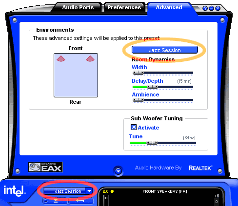 Закладка «Advanced» позволяет изменять предустановки виртуального окружения (фактически — параметры реверберации), давая возможность подстраивать их под свой вкус, и регулировать частоту среза у фильтра низких частот (называется это «Sub-Woofer Tuning»). Достаточно неплохая идея, но реализована она, с нашей точки зрения, несколько неполно: действительно, возможность создания пользовательских пресетов окружения, наверное, будет востребована — но наиболее логичным было бы дать пользователю возможность именно создавать собственные пресеты, параметры же предустановленных, наоборот, заблокировать. Вместо этого нам предлагают лишь изменять уже существующие. Таким образом, если нам нужен пресет для какого-нибудь «очень длинного коридора» — придется записывать его куда-нибудь в «Theater» или «Cathedral» (имя предустановленных пресетов изменить невозможно).