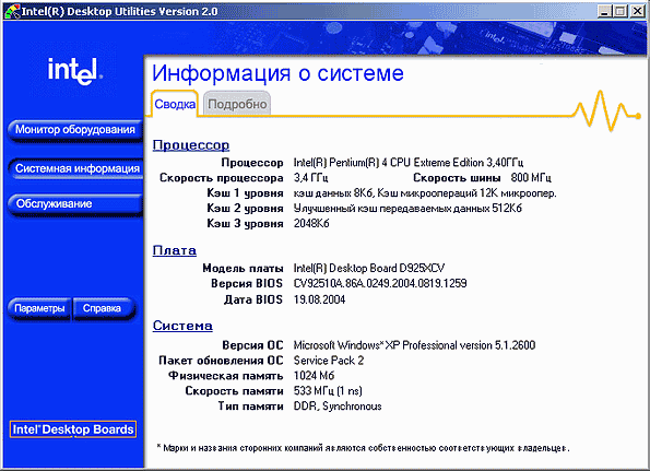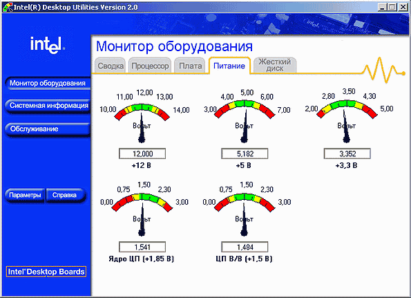 - Intel Active Monitor, представляющий собой разновидность утилиты системного мониторинга, позволяющую динамически отслеживать основные параметры системы: температуру, скорость вращения вентиляторов, напряжение питания… в общем — стандартный — малый джентльменский набор». Кроме того, одна из закладок окна Active Monitor предоставляет информацию общего плана об установленных в системе устройствах. Разумеется, она не настолько развернутая, как отдельные «навороченные» программы диагностики, но в то же время вполне достаточная, например, для того, чтобы пользователь смог на ее основании описать инженеру сервисного центра по телефону конфигурацию своего компьютера.