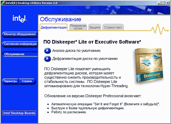 Заметим, что Stress Test от PassMark Software — это та же самая программа, что используется в Intel Desktop Control Center. Кроме того, нам не очень понравилась функциональность дефрагментатора Diskeeper Lite — его установка может иметь смысл разве что для пользователей Windows 2000, лишенной собственного дефрагментатора. Что касается обладателей компьютеров с ОС Windows XP — то ее встроенный дефрагментатор по возможностям полностью аналогичен Diskeeper Lite и отличается от него только интерфейсом.
