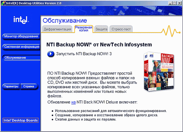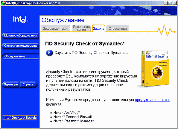 - Intel Desktop Utilites. Следует отметить, что Active Monitor — «уходящее», хоть и еще поддерживаемое ПО, и работает только с платами на базе i845x/865x/875P и еще более старыми. Для новых плат (чипсеты «девятисотой» серии) предназначен более функциональный пакет — Intel Desktop Utilites. Усовершенствования коснулись в основном функциональности: IDU отслеживает большее количество параметров, позволяет более тонко управлять режимами мониторинга, и т. д. Однако есть и принципиальное отличие — в полную версию пакета входит четыре сторонних программы: дефрагментатор Diskeeper Lite, пакет резервного копирования NTI Backup Now, ПО для проверки стабильности функционирования аппаратной части компьютера PassMark Stress Test и Symantec Security Check — одновременно программа и web-служба, предназначенная для тестирования системы на предмет защищенности от хакерских атак. Напомним: все это вы получаете вместе с пакетом Intel Desktop Utilites совершенно бесплатно.