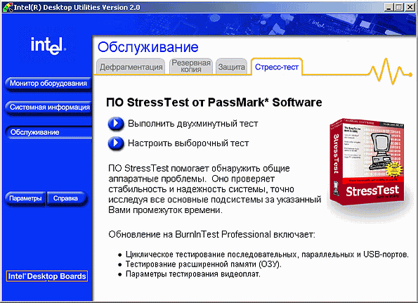 Боковая закладка «Обслуживание» предназначена для запуска внешних программ, идущих в комплекте с Intel Desktop Utilites. Следует заметить, что IDU существует в двух вариантах: полный, со всеми дополнительными программами, и урезанный, из которого они исключены. Бесплатны и доступны для загрузки с сайта Intel оба варианта поставки, но пользователей модемов может смутить размер первого: он составляет порядка 50 мегабайт (урезанный — порядка 7 мегабайт). Названия программ и их назначение вполне понятны из скриншотов, приведенных ниже.
