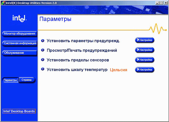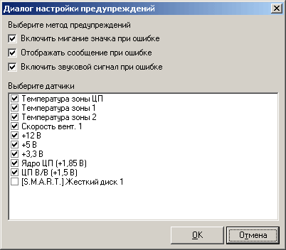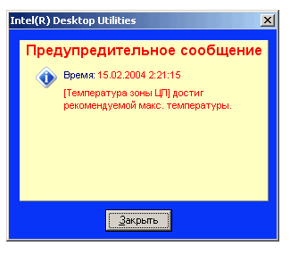 Если одна из отслеживаемых характеристик вышла за пределы пороговых значений, Intel Desktop Utilites активирует окно с предупреждением, мигает значком в трее, и издает звук. Часть этих предупреждений (или даже все) можно отключить в диалоге настройки программы (он будет описан позже).