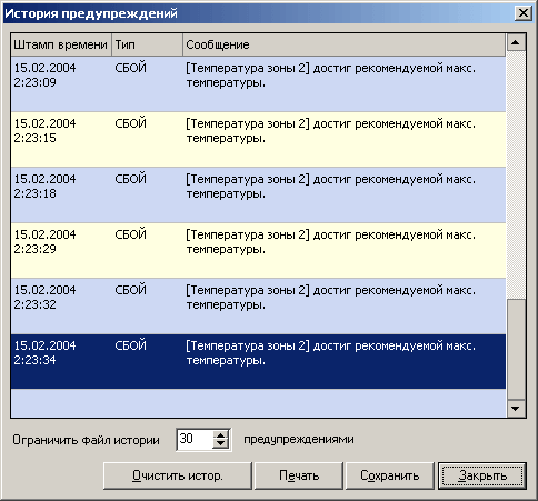 Закладка «Параметры» позволяет настроить виды предупреждений, пороговые значения отслеживаемых параметров, и просмотреть историю предупреждений.