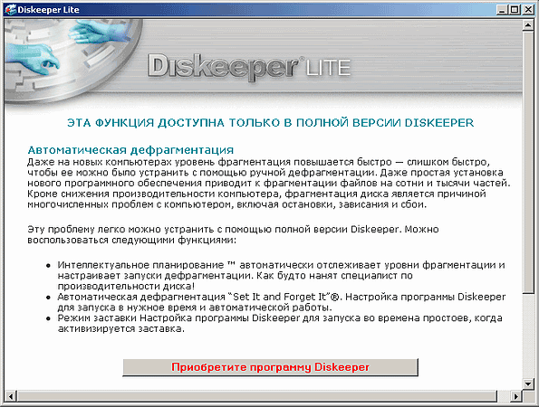 Впрочем, строго говоря, встроенный дефрагментатор Windows XP — это и есть Diskeeper Lite, только оттуда убраны все лишние кнопки, вызывающие функции, недоступные в Lite-версии. А вот у инсталлируемого вместе с DCC «родного» Lite-дефрагментатора от Executive Software, они присутствуют, но нажатие вызывает лишь появление надоедливого окошка, уговаривающего приобрести полную версию: