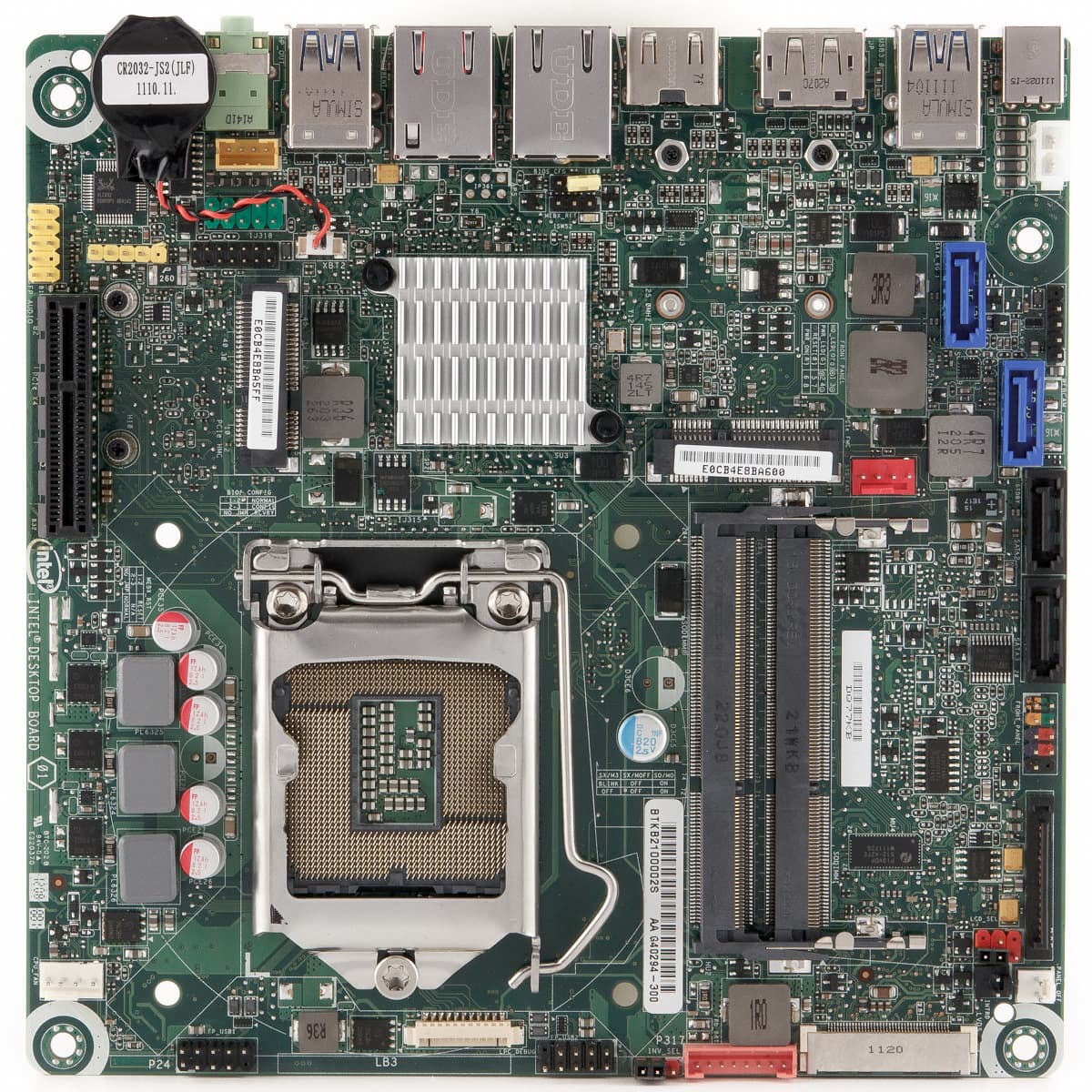 DQ77KB обходится в основном только чипсетом — никаких дополнительных контроллеров USB или SATA на ней нет. Поддержка подключения накопителей состоит из двух портов SATA 6 Гбит/с, двух SATA 3 Гбит/с и одного mSATA, совмещенного с полноразмерным miniPCIe. Разъемы SATA удобно расположены около края платы. Для USB-периферии есть четыре USB 3.0 на задней панели и внутренние разъемы на пять портов. Из первых два поддерживают режимы ускоренной зарядки мобильных устройств.