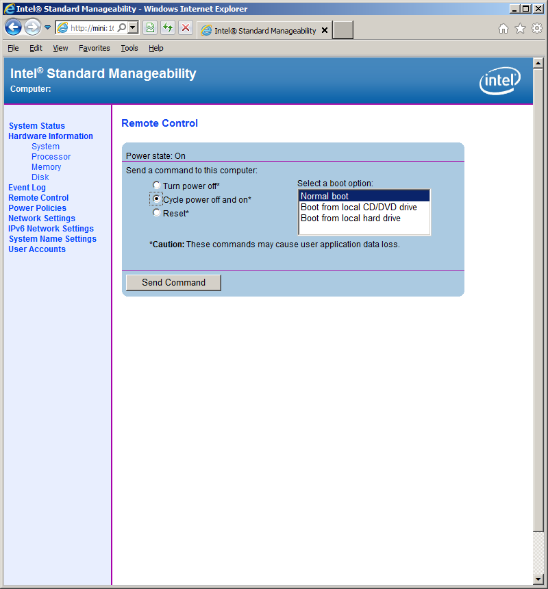 На этом этапе уже можно посмотреть на первые результаты. Одна из обеспечиваемых технологией возможностей — доступ к конфигурации ПК через браузер. Для этого нужно обратиться по адресу http://<имя системы>:16992 и ввести указанный ранее в профиле пароль (имя пользователя — admin). Можно использовать и https, но для этого необходимо установить и настроить сервер для работы с сертификатами и включить эту опцию в профиль. На реализованном средствами AMT сервере можно уточнить конфигурацию системы, посмотреть список событий, включить, выключить или перезагрузить компьютер (с возможностью выбора устройства для загрузки), изменить сетевые настройки. Причем все это работает, даже когда система выключена. Жаль, что здесь нет информации от аппаратных датчиков.