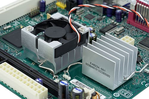 На поверхности платы расположены два стандартных трехконтактных разъема для подключения вентиляторов: MCH_Fan, к которому вентилятор подключен по умолчанию, и Case_Fan, который по умолчанию свободен и в теории предназначен для подключения корпусного вентилятора.