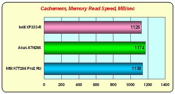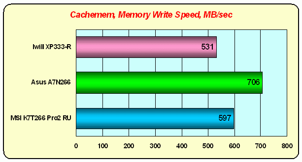 Вот все и стало на свои места. Низкоуровневый тест "обмануть" трудно, он сосредотачивается на измерении одной-единственной функции чипсета, зато делает это тщательно и хорошо. MAGiK 1 действительно почти догнал KT266A по скорости чтения из памяти, но проигрывает продукту VIA по скорости записи. Кстати, обратите внимание на nForce — этот чипсет тоже не сильно оторвался от KT266A по скорости чтения, но по скорости записи отставил далеко позади всех остальных. Еще один Intel что ли? :)