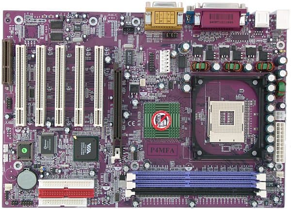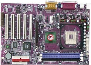 Платы этой компании не устают поражать нас пестротой своего окраса — в данном случае PCB цвета баклажана соединена с сиреневыми разъемами и темно-зеленым радиатором. Но конечно, настоящая изюминка платы — поддержка обоих типов памяти (SDR и DDR SDRAM). Плата попала к нам в OEM-комплектации.