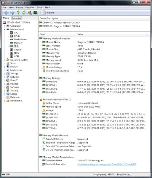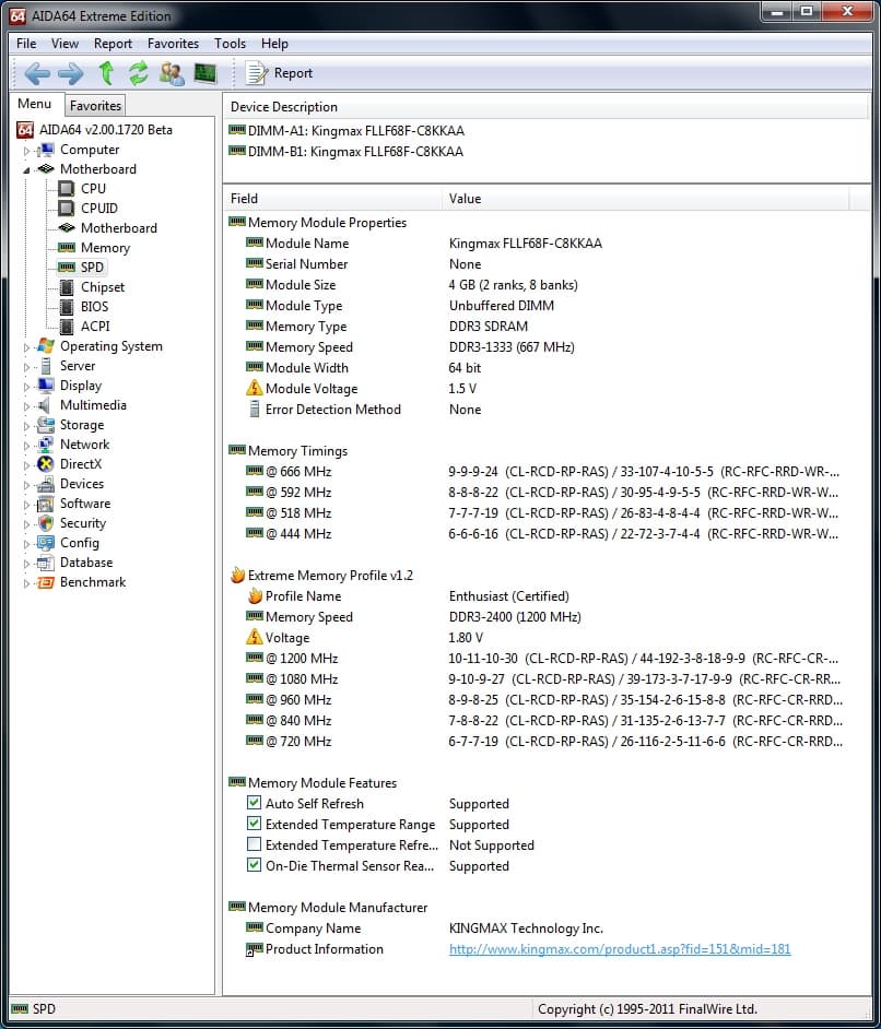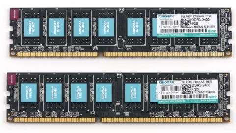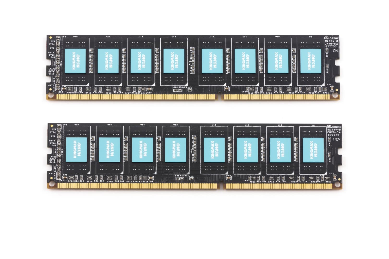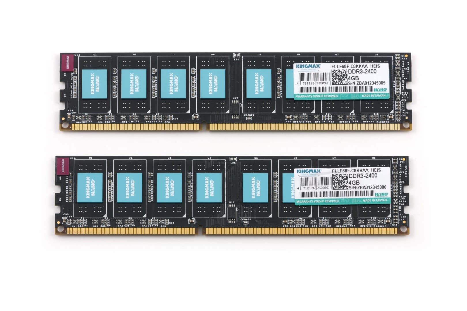 Двухканальный комплект памяти (2×4 ГБ) Kingmax интересен тем, что предлагает достаточно высокую максимальную частоту DDR3-2400, но в то же время не имеет радиаторов, что в данном классе модулей памяти является, как минимум, необычным решением.