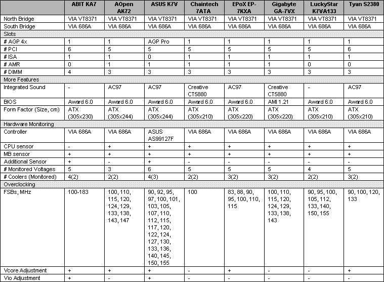 Здесь лидеров трое — ASUS K7V (уже во второй раз) и присоединившиеся к нему ABIT KA7 и Gigabyte GA-7VX.