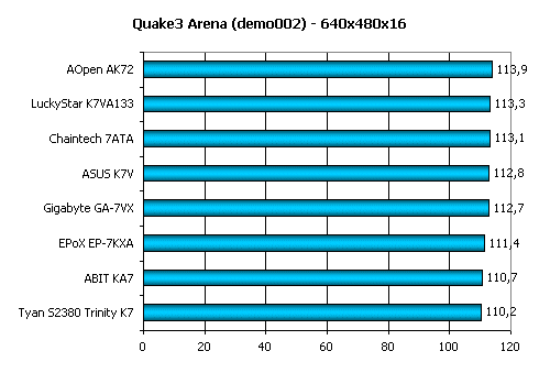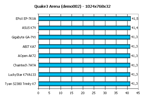 Видите, как поменялась картина по сравнению с предыдущими тестами? Виной этому выступает как раз влияние, оказываемое скоростью работы порта AGP и его таймингами. По этому тесту лидером выступает EPoX EP-7KXA.
