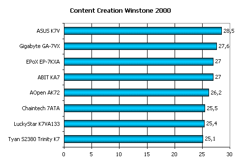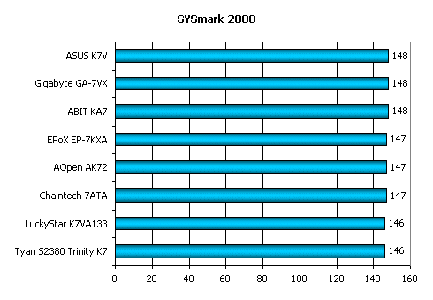 По результатам этого теста с большим отрывом лидирует ASUS K7V. Поскольку офисные приложения — хороший индикатор скорости работы с памятью и L2 кешем процессора, должен отметить, что именно ASUS реализовал функционирование шины памяти и системной шины самым оптимальным образом.