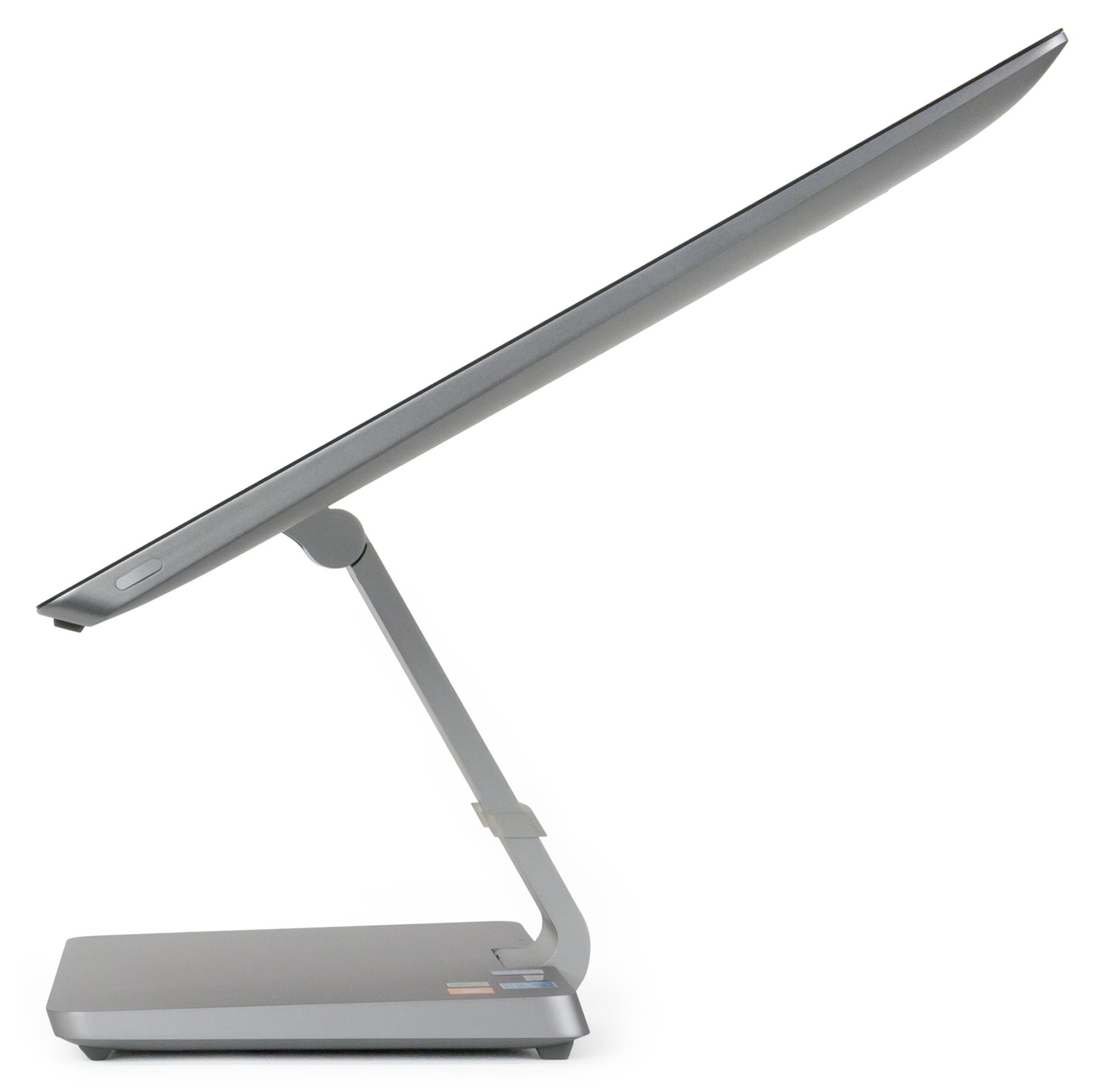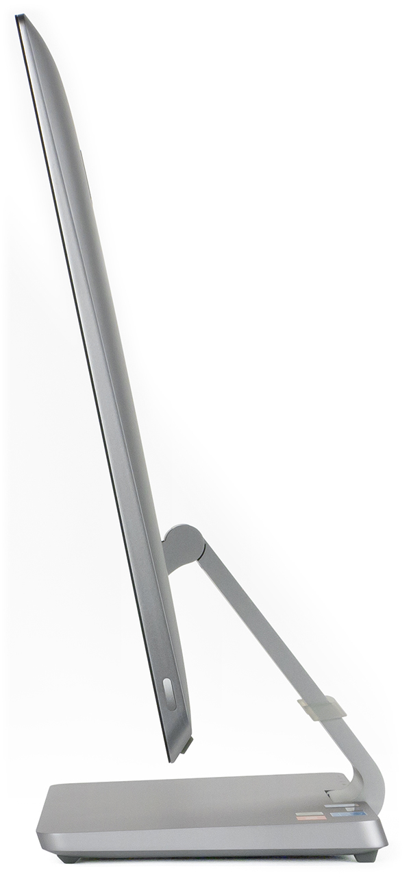 Одно из весомых преимуществ моноблока Lenovo A740 заключается в том, что конструкция ножки позволяет легко регулировать высоту и наклон экрана. Сама ножка имеет длину примерно 22 см. С одной стороны она прикреплена к экрану, а с другой — к подставке, причем с обоих концов сочленение ножки представляет собой осевой шарнир. Это позволяет поворачивать экран относительно осевого шарнира ножки, а ножку поворачивать относительно осевого шарнира подставки. В результате можно менять положение экрана и по высоте, и по углу наклона. Нужно отметить, что в любом положении экран прочно фиксируется. Никакого люфта здесь нет, что немаловажно, учитывая возможность сенсорного ввода.