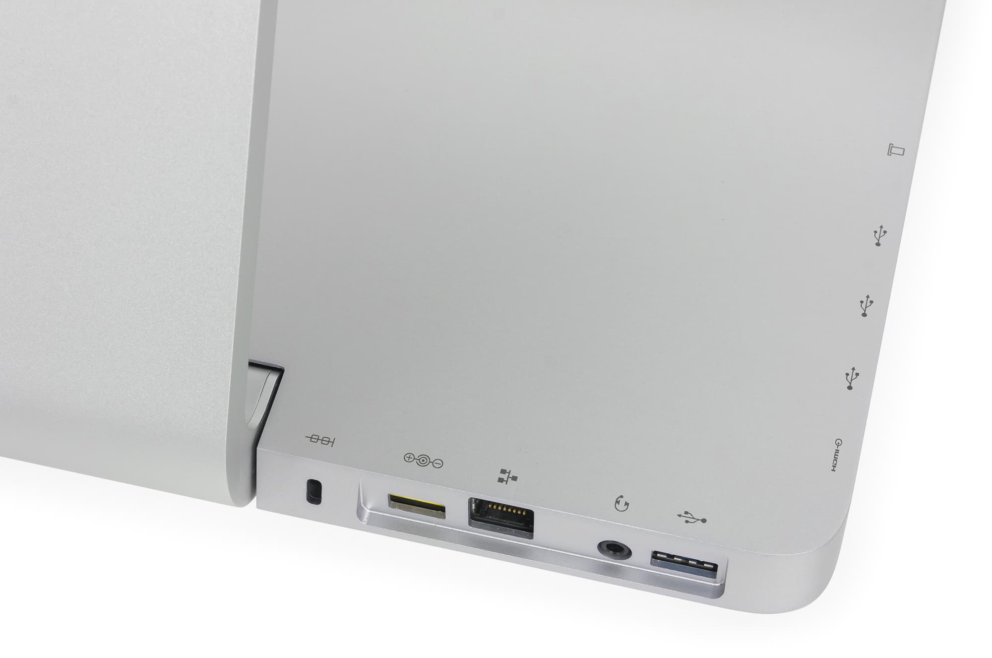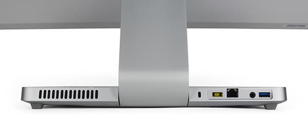На заднем торце корпуса расположены еще несколько разъемов: разъем для подключения адаптера питания, разъем RJ-45, комбинированный аудиоразъем типа миниджек (наушники, микрофон), а также еще один порт USB 3.0.