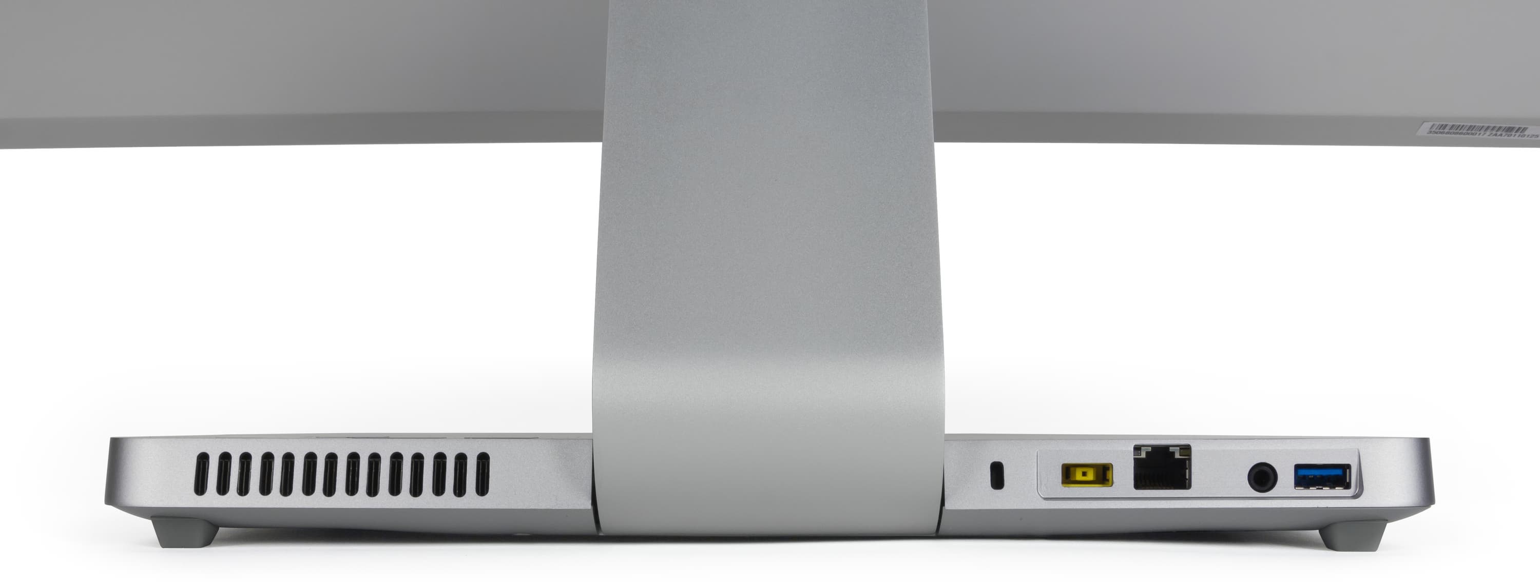 Корпус моноблока (задняя поверхность экрана, подставка моноблока и ножка экрана) выполнен из металла, выкрашенного в серебристый цвет. По всей видимости, это алюминиевый сплав, однако точно мы этого утверждать не можем.