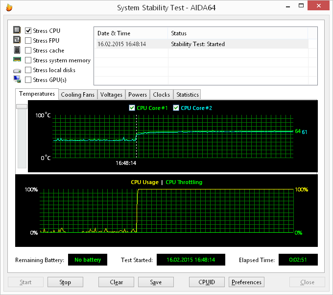 При загрузке процессора тестом Stress CPU (утилита AIDA64 Extreme Edition, тест на стабильность системы), который использует целочисленные вычисления, частота процессора составляет 3,2 ГГц (напомним, что для процессора Intel Core i7-4558U максимальная частота в режиме Intel Turbo Boost составляет 3,3 ГГц). Температура процессора в этом режиме загрузки составляет 64 °С.