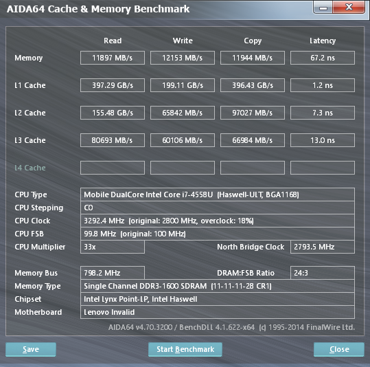 Согласно данным утилиты AIDA64 Cache & Memory Benchmark, скорость записи данных в память составляет 12153 МБ/с, а скорость чтения — 11897 МБ/с. Для памяти DDR3-1600 с пиковой пропускной способностью 12800 МБ/с это вполне типичный результат в одноканальном режиме работы.