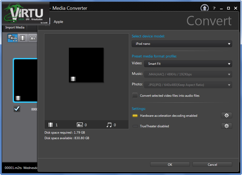 После добавления основного файла с фильмом в программу остается только указать, использовать ли аппаратное ускорение, и какое именно. Правда, названы соответствующие настройки у MediaEspresso весьма своеобразно: для того, чтобы задействовать аппаратную поддержку CUDA, надо включить «Hardware acceleration encoding», а для задействования QuickSync — «Hardware acceleration decoding». Данная терминология полностью противоречит не только здравому смыслу, но и практике (о чем далее): декодирование (действительно необходимое в процессе транскодирования) — процесс, требующий минимума ресурсов, и даже ускорение его до бесконечности не способно сократить общее время транскодирования хотя бы вдвое. Очевидно, названия настроек остались от старых времен (графическое ядро Intel в процессах Clarkdale умело только декодировать видео). Однако функционирование настроек в итоге понятно, и, преодолев страх перед использованными терминами, мы получили 2 альтернативных (комбинируемых) варианта ускорения. Отметим, что QuickSync действительно может быть задействован только при использовании Virtu или при подключении монитора (на котором запускается MediaEspresso) к видеовыходам на материнской плате. А вот ускорение за счет CUDA можно было получить, просто установив видеокарту NVIDIA в систему.