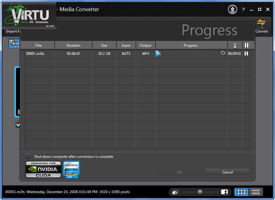 Для транскодирования мы использовали программу CyberLink MediaEspresso — один из двух «наиболее сертифицированных» проектов с поддержкой QuickSync и Virtu. MediaEspresso интересна тем, что поддерживает не только QuickSync, но и CUDA, а поскольку тесты мы проводили с внешней картой NVIDIA GeForce GTX 580, появилась возможность сравнить разные реализации прямо на одном стенде. В качестве исходного материала нами был выбран полноценный фильм, взятый в виде ремукса BD-диска на системном винчестере. На тестирование при этом ушло больше времени, но зато наши читатели получают возможность не только понять, кто кого быстрее, но и сразу увидеть актуальные цифры для транскодирования 2-часового фильма.