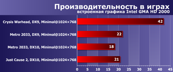 Ну и раз мы заговорили об играх, не можем не привести показатели встроенной графики GMA HD 2000 (в процессоре Core i5-2400, с которым мы проводили тесты). Мы следуем принятой в последнее время на сайте концепции тестировать не старые игры в 640×480, а современные — и в сколько-нибудь приемлемом разрешении, пусть и ценой «выкручивания» всех настроек качества графики на минимум.