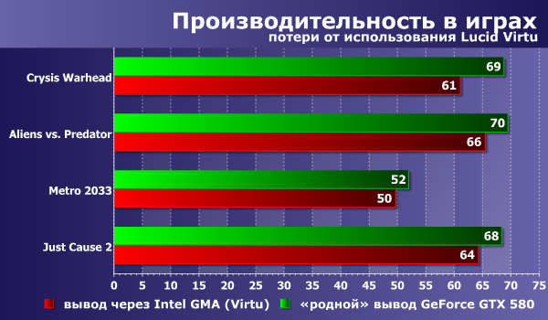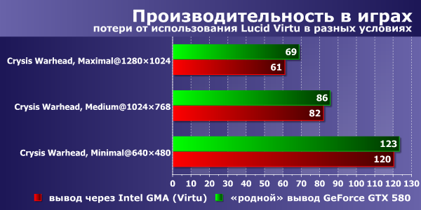 Выяснилось, что величина потерь растет с усложнением картинки (подъемом разрешения, уровня анизотропной фильтрации и сглаживания и пр.), а в минимальном режиме падения производительности от вывода картинки через Virtu почти нет. По-видимому, объяснение тут простейшее: в младших режимах видеокарта перестает быть ограничивающим фактором, и драйвер Lucid успевает делать свое «черное дело» совсем незаметно. Теоретически казалось возможным, что при этом будут заметнее потери из-за работы драйвера с памятью (раз производительность начинает упираться в процессор, то, скорее всего, и скорость обмена с памятью начинает играть бо́льшую роль), однако практика эту теорию не подтвердила: эффекта или нет вовсе, или он с лихвой перекрывается другими факторами.